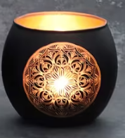 - Porte-bougies en verre noir Rangoli Mandala avec des motifs floraux et géométriques complexes