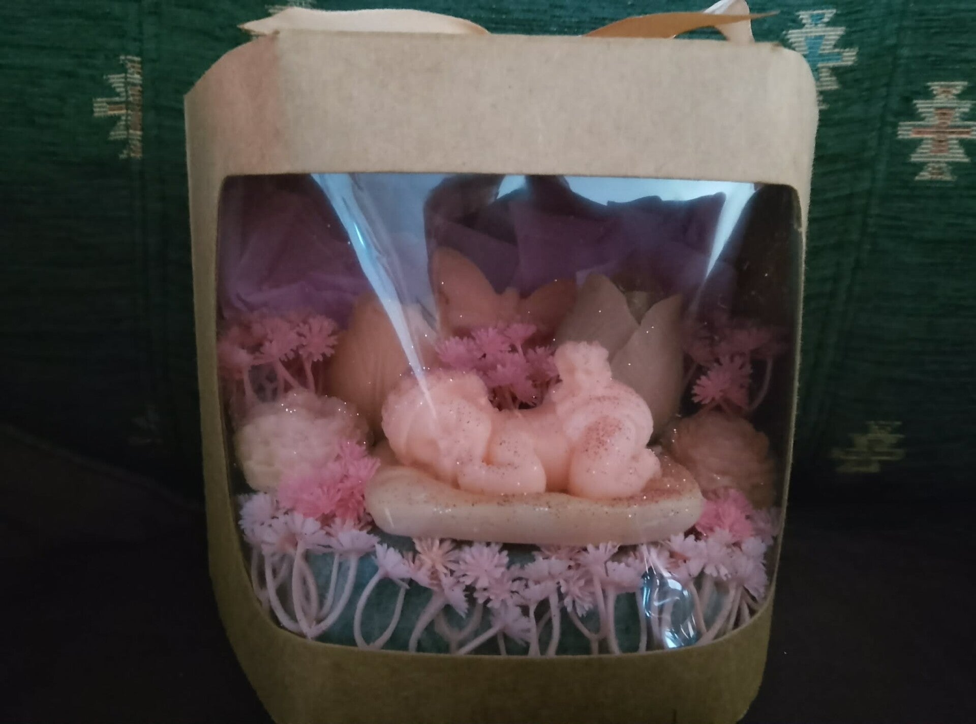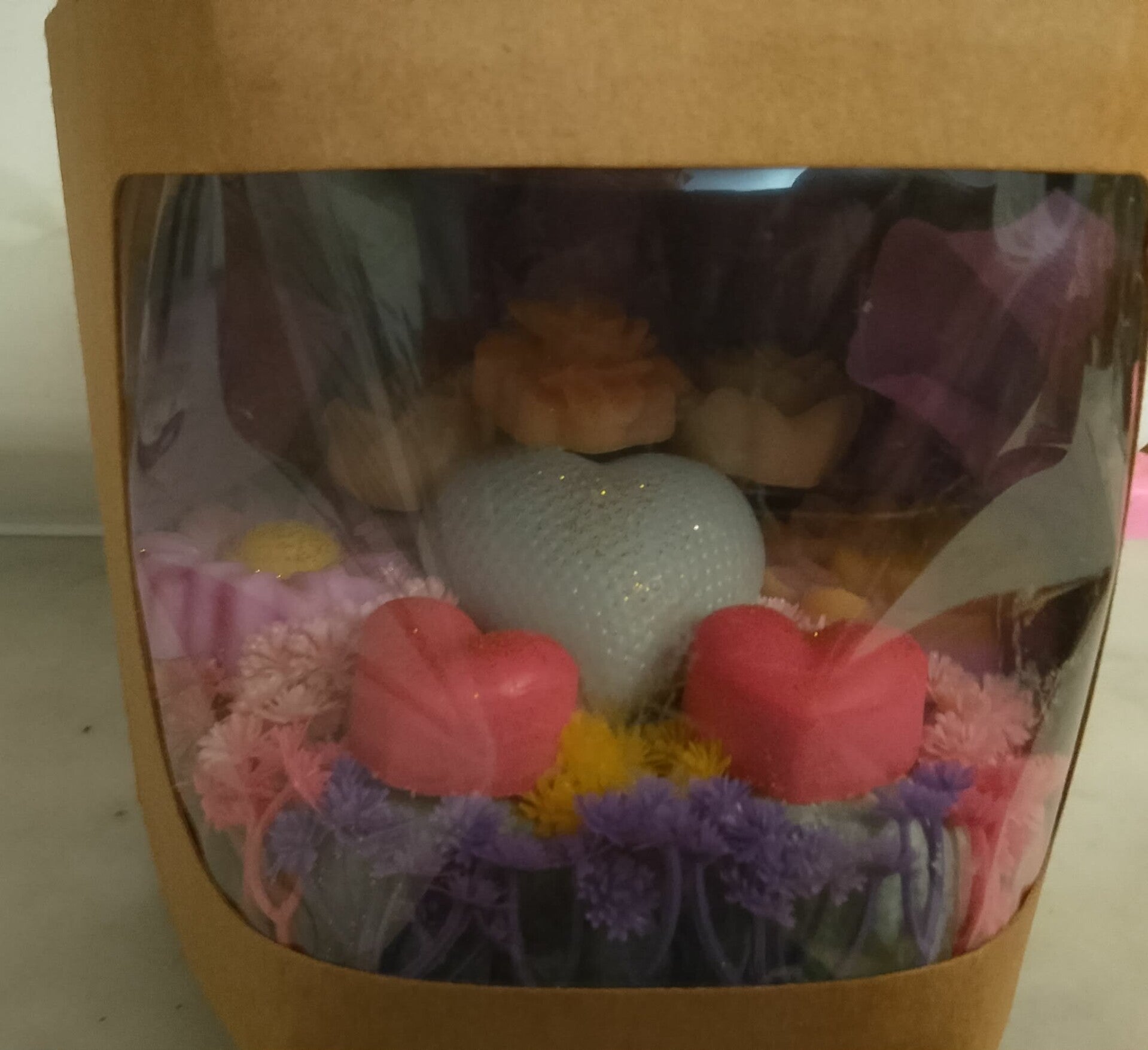 Dans une boîte cartonnée, un gros fondant parfumé au milieu et des petits autour.